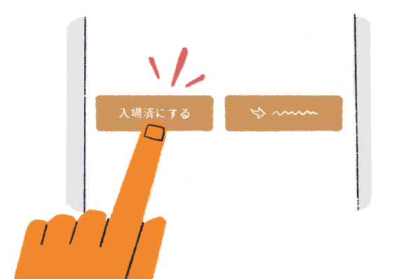 お客様がteketにログインし、「入場済にする」ボタンを受付スタッフがタップする方式です。主催者側で受付用の端末を用意する必要がないため、端末費用や設定の手間がかかりません。